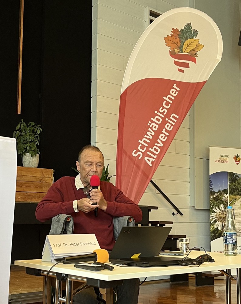 Biologieprofessor Dr. Peter Poschlod von der Universität Regensburg nahm die Teilnehmenden des Naturschutztags mit auf eine Reise durch die Geschichte der Weidekultur und damit der Kulturlandschaft Wiesen. Sie entstand im Neolithikum in Anatolien und verbreitete sich von dort aus Richtung Mitteleuropa. Die ersten schriftlichen Nachweise über Wiesen stammen aus der Römerzeit. In dieser Periode kamen auch viele Arten nach Süddeutschland – oft durch das Heu, dass die Römer als Futter für ihre Pferde mitführten.