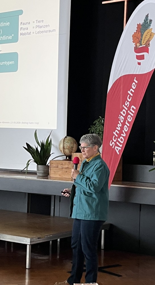 Trotz ihrer Bedeutung als wertvoller Naturraum sind die FFH-Mähwiesen in ihrem Bestand bedroht. Katrin Voigt vom Referat 56 Naturschutz und Landschaftspflege im Regierungspräsidium Tübingen zeigte eine Tabelle zu ihrem Erhaltungszustand mit einem Zeitstrahl seit 2007 – unverändert ist dieser mit der Signalfarbe rot eingefärbt. Dennoch gebe es Hoffnung, berichtete Voigt, zeigte sich doch der Gesamttrend 2025 als „sich verbessernd“ nach oben.
